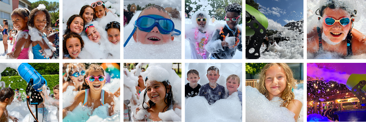Our foam party service is famous for filling safe flat spaces with mountains of fluffy fun foam. We can spray thick on on home gardens or driveways, school playgrounds, pub beer gardens or car parks, at venues holding summer camps, at music or fun festival, at sports days, community gathering and fun days.