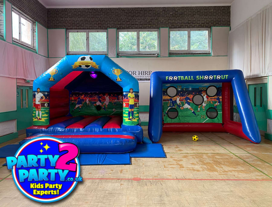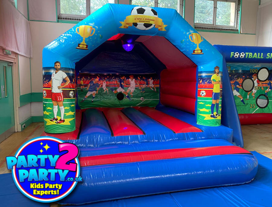 15x12ft Football Themed Bouncy Castle Bluetooth Speaker and Disco Light. Football Penalty Shootout Basketball Shootout Mini Football Pitch