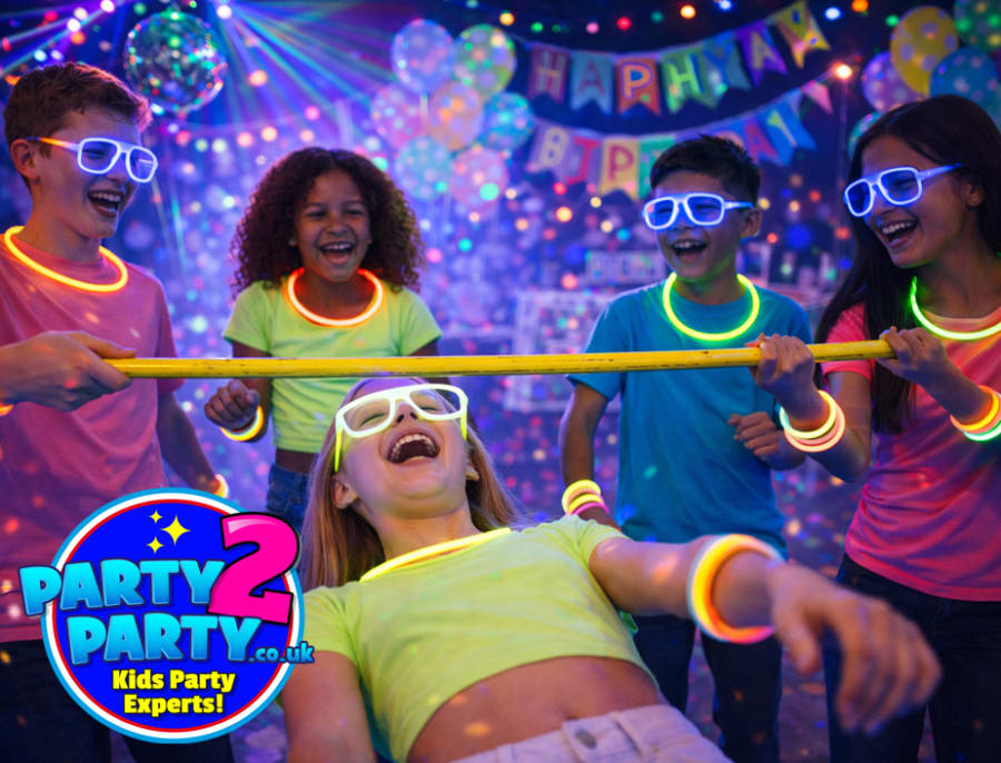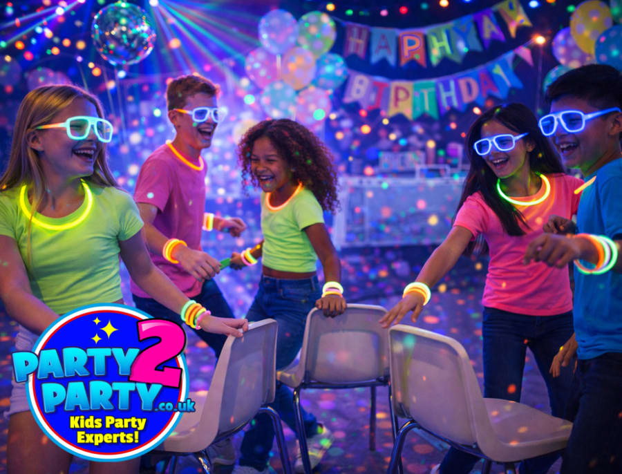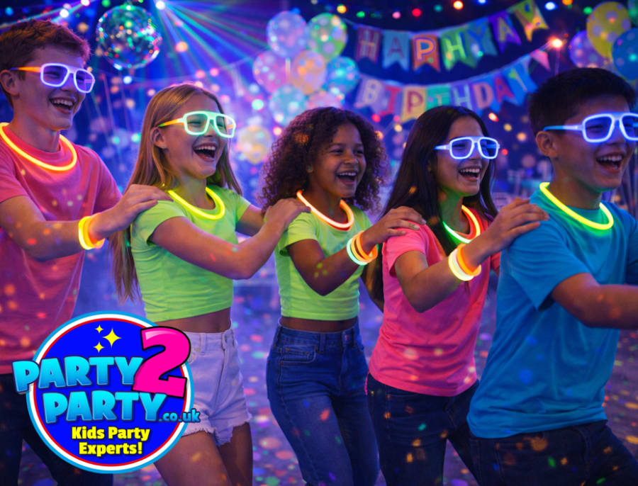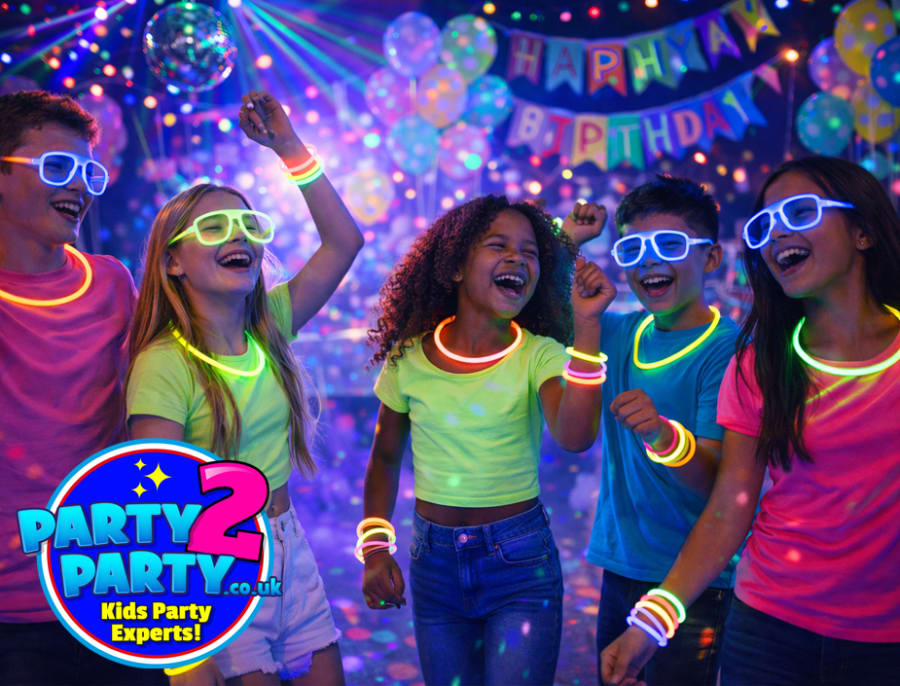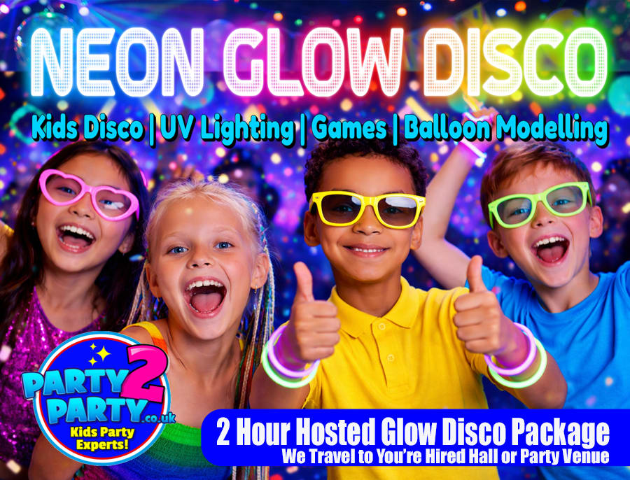 Glow-In-The-Dark Neon Mobile Disco Party Package - DJ Host & Entertainer Joey - East Midlands Coverage - Full Mobile Disco Setup, Modern Sound and Ultra-Violet Disco Lighting, Top of the Pops Music Played, Organised Games, Prizes and Balloon Modelling Package.