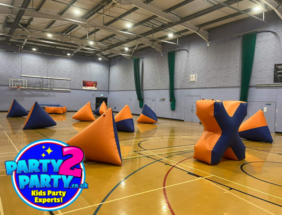 A full battle zone scenario is setup with "Nerf" coloured obstructions such as inflatable bunkers, barrels and camouflage to hide behind and shoot from.